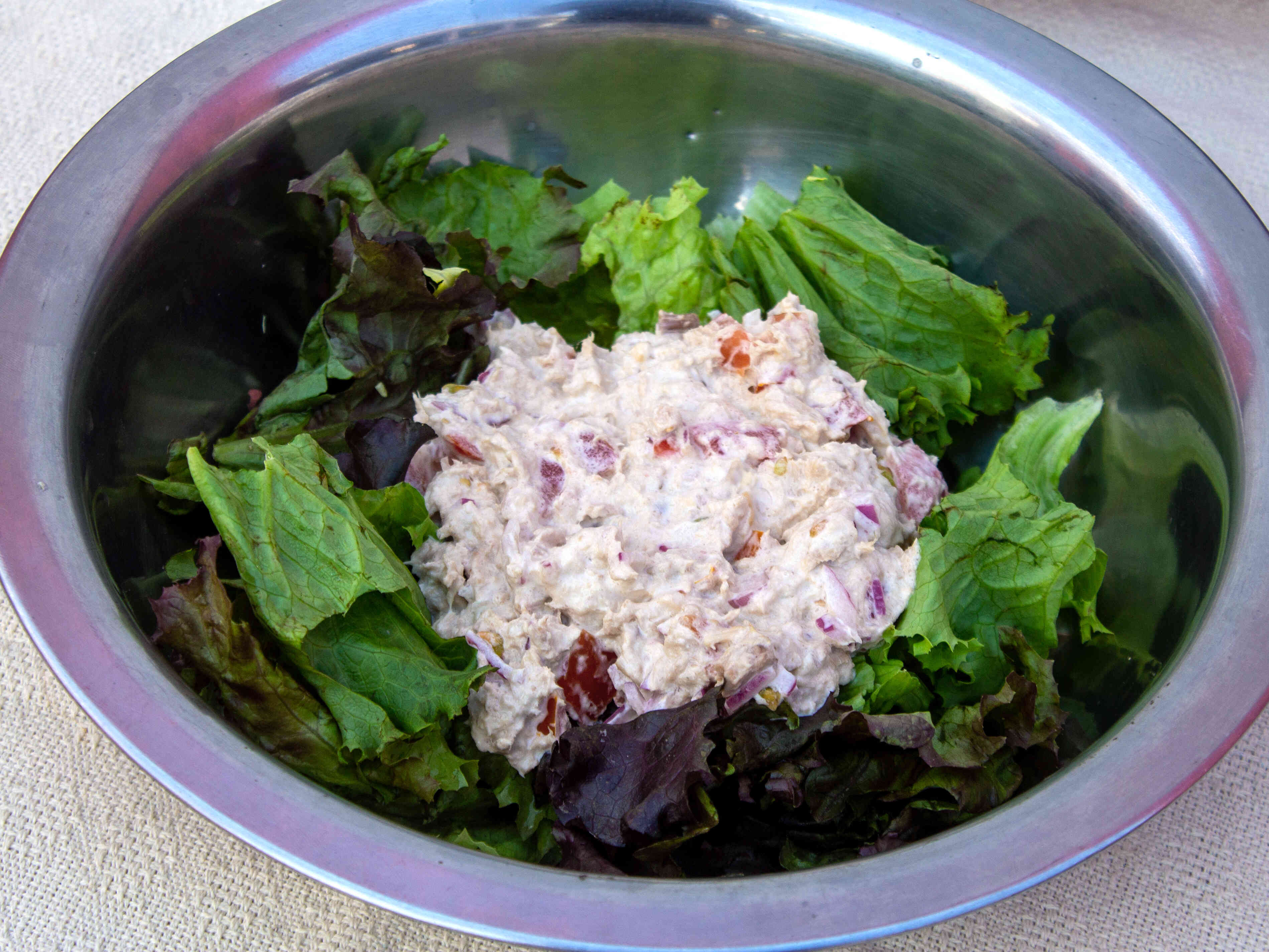 Combinación de lechugas, jitomate, cebolla morada, mayonesa y atún.