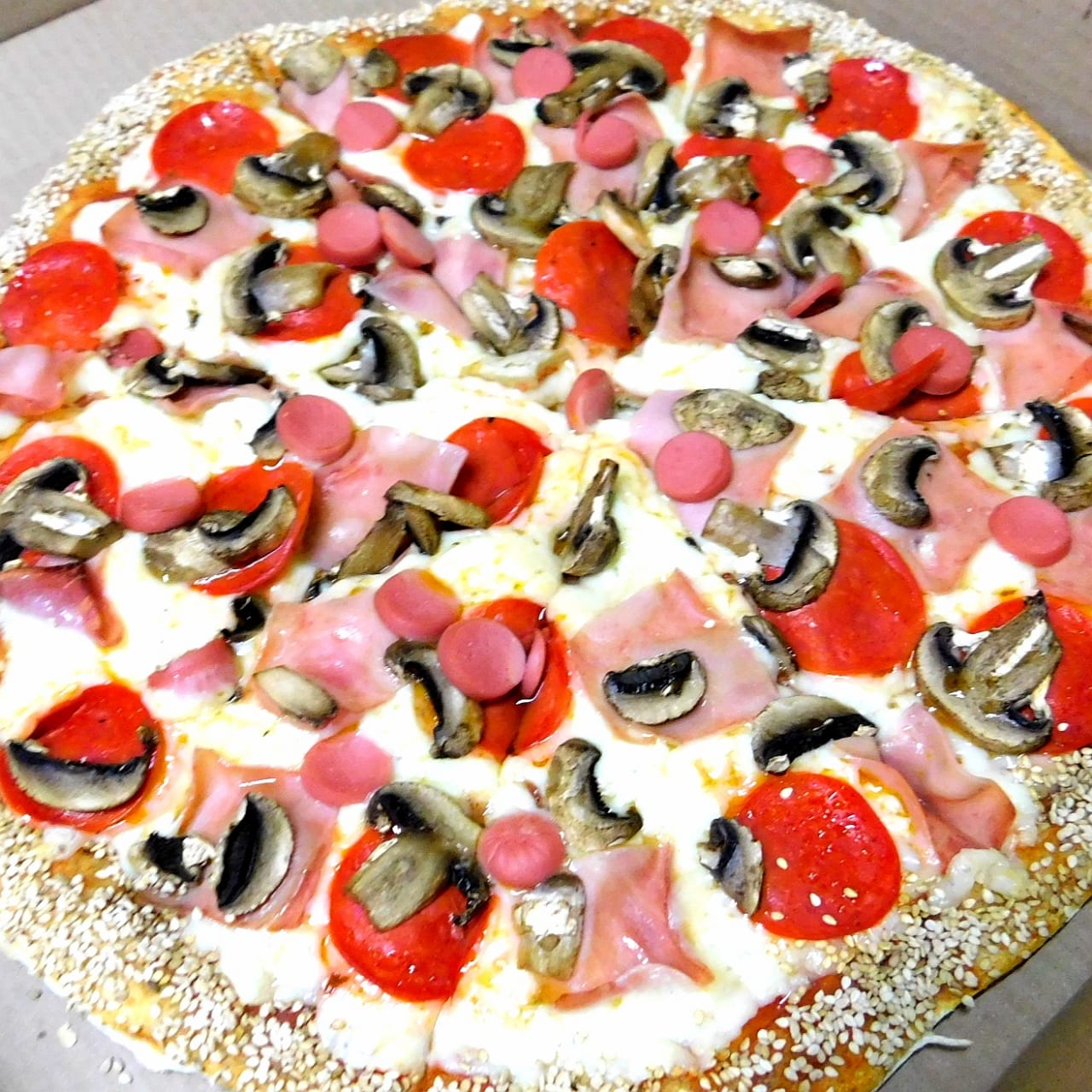 Una rica combinación de pepperoni, jamón, salchicha y champiñones.