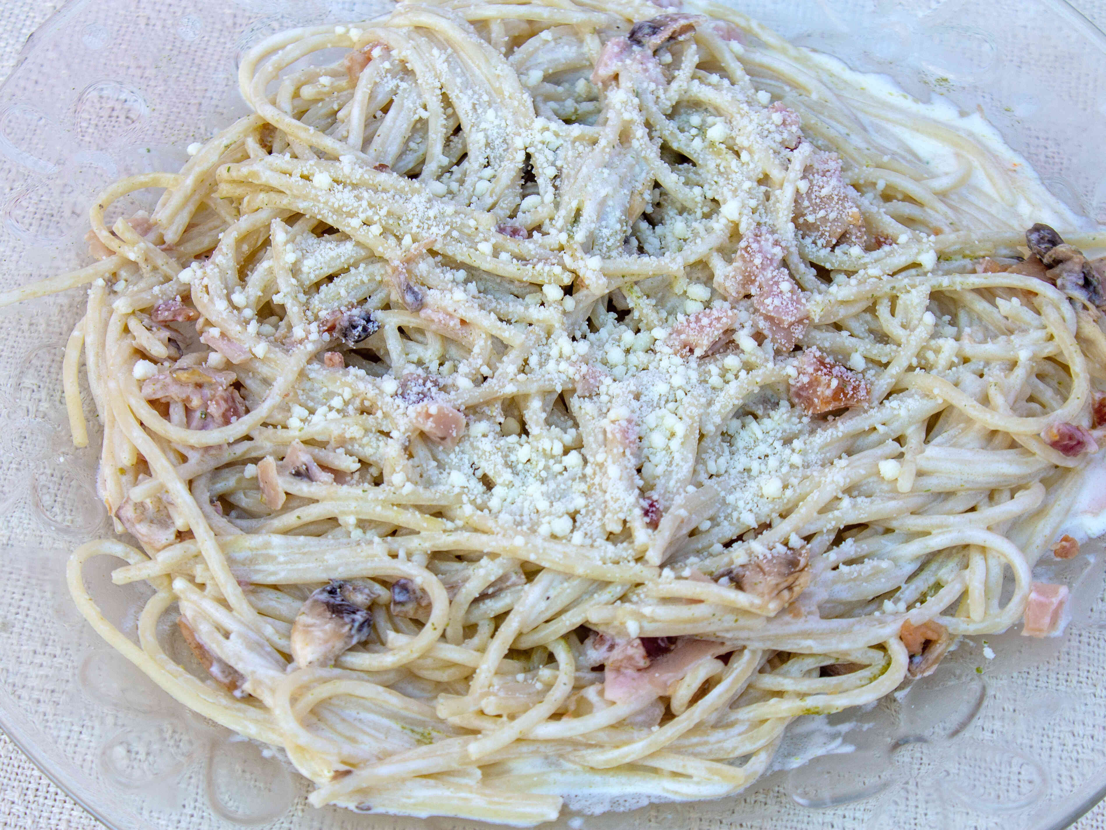 Deliciosa pasta preparada con mantequilla, crema, jamón, tocino, champiñones y queso parmesano.