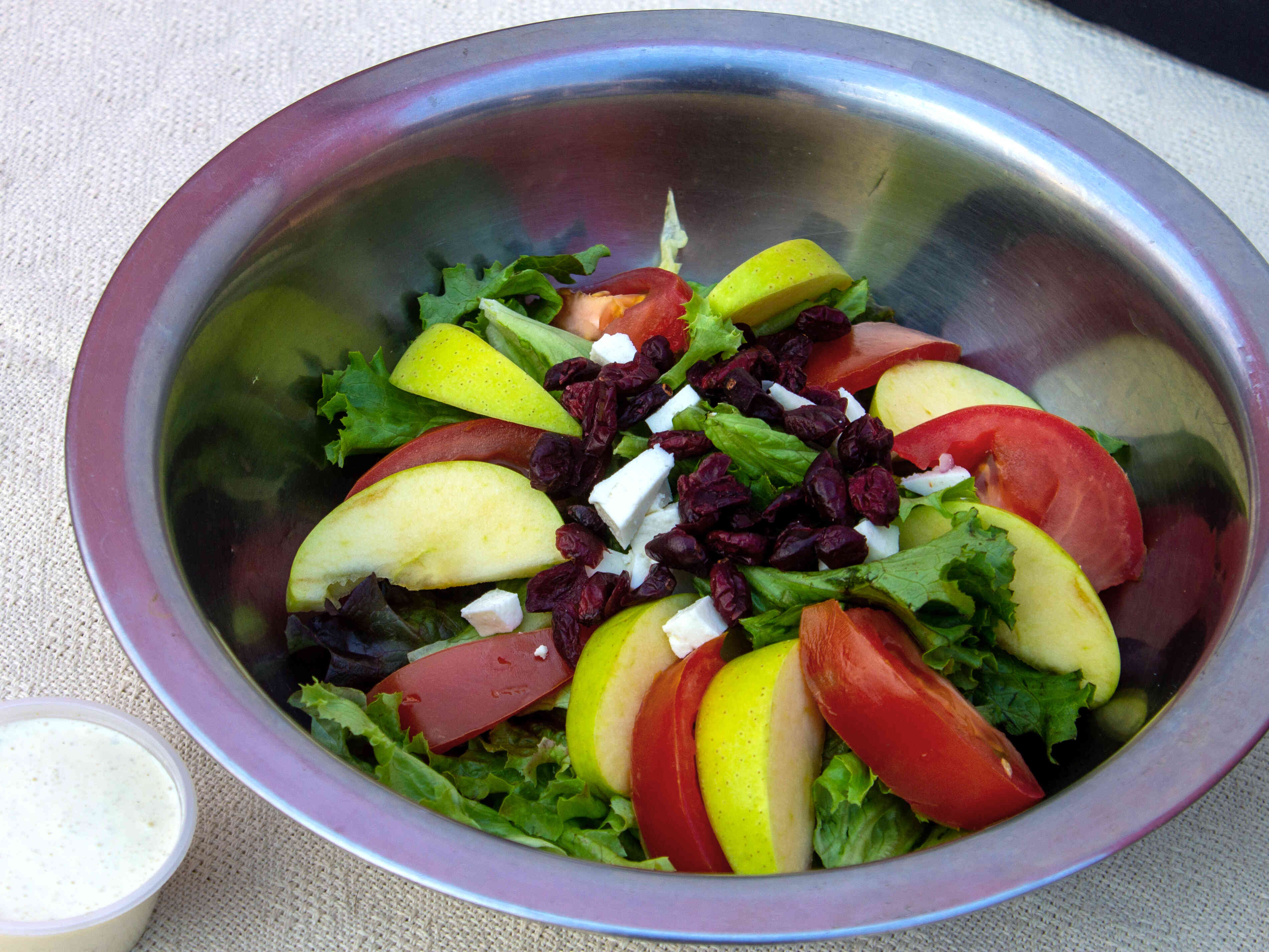 Combinación de lechugas, jitomate, manzana, queso saltierra, arándanos y aderezo de la casa.
