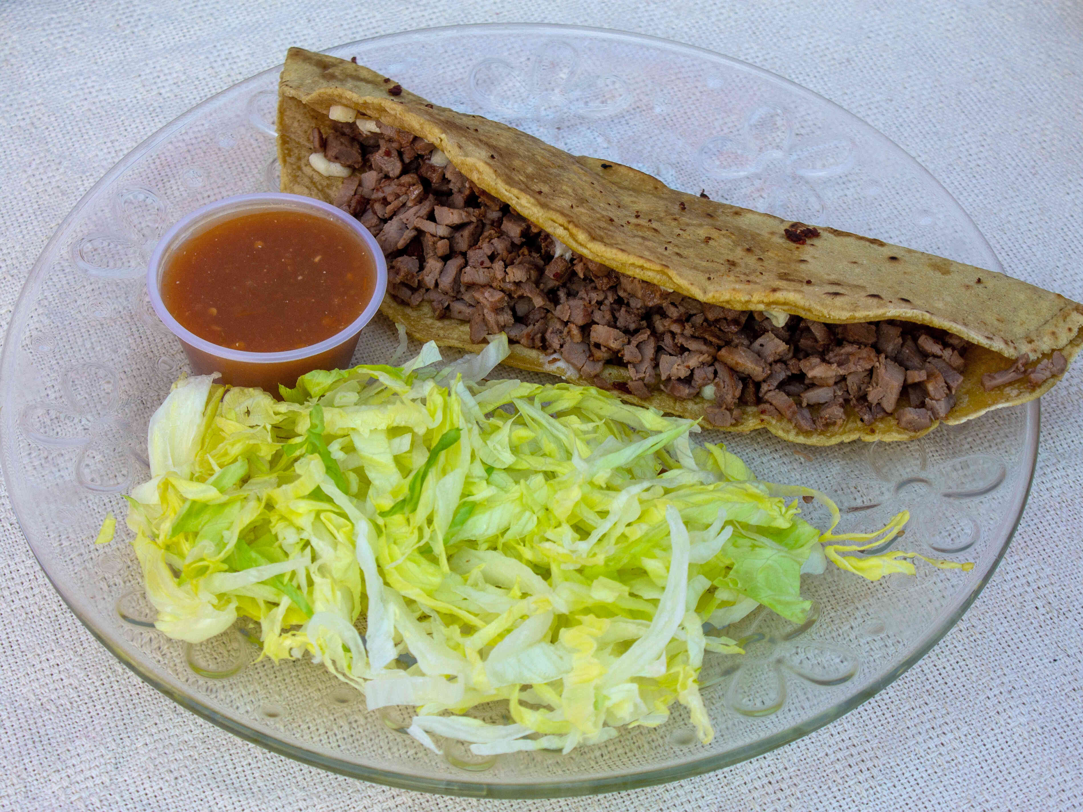 Deliciosa quesadilla de maíz con exquisita arrachera y queso chihuahua. Incluye lechuga, crema y salsa.