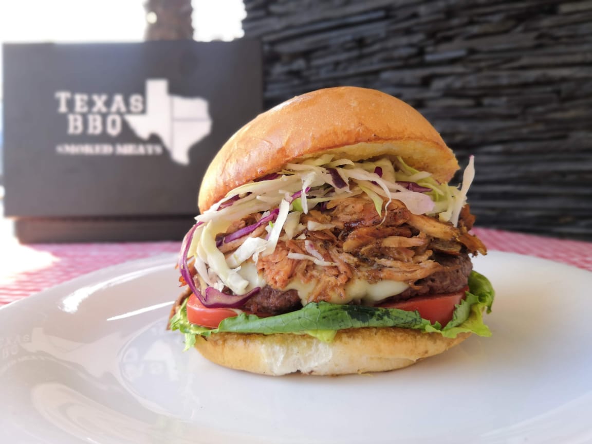 Nuestra nueva carne de res black angus a la parrilla con queso suizo gratinado, con un toque de pulled pork(cerdo a la leña), lechuga, tomate, ensalada coleslaw, pepinillos y toque de salsa BBQ. No incluye papas.