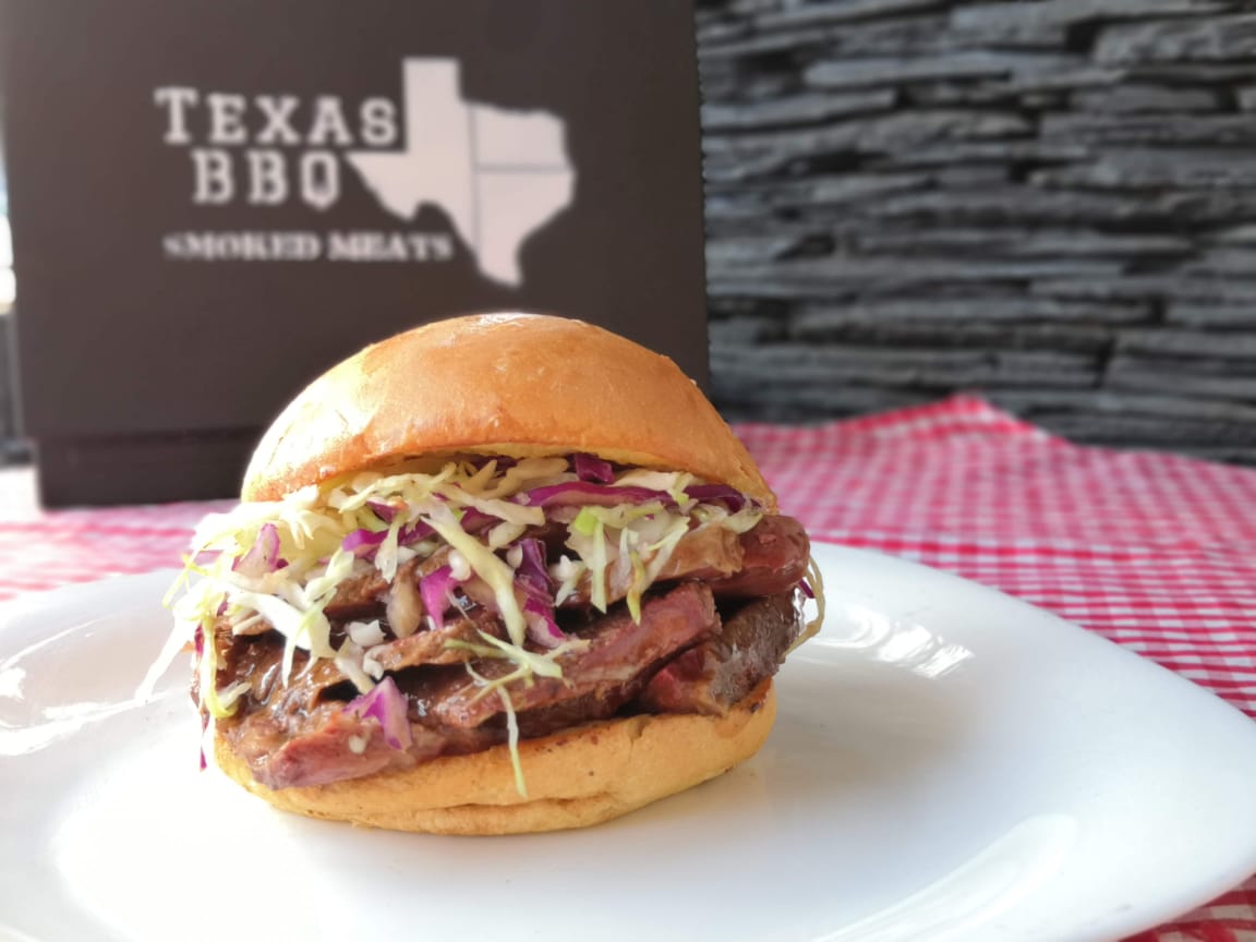 Sándwich de pecho de res ahumado lentamente a la leña con ensalada coleslaw y pepinillos, en pan de hamburguesa y toque de Salsa BBQ. No incluye papas.