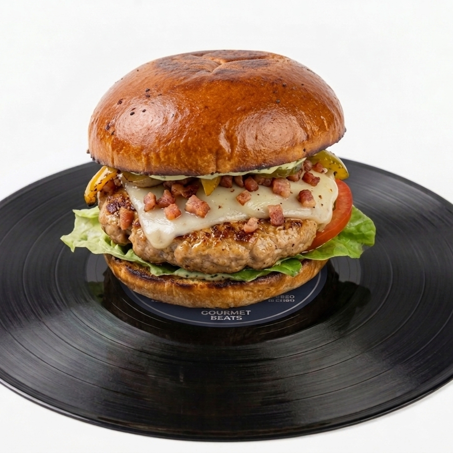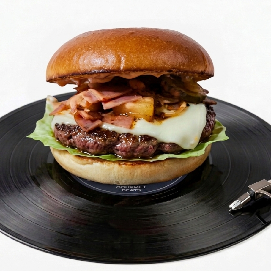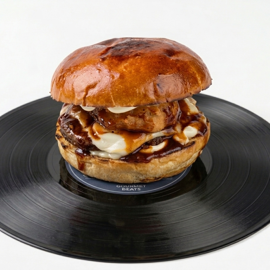Nuestra mezcla más distorsionada. Doble queso suizo, dos aros de cebolla marcando el ritmo y nuestra BBQ Beer para un final épico y ahumado.