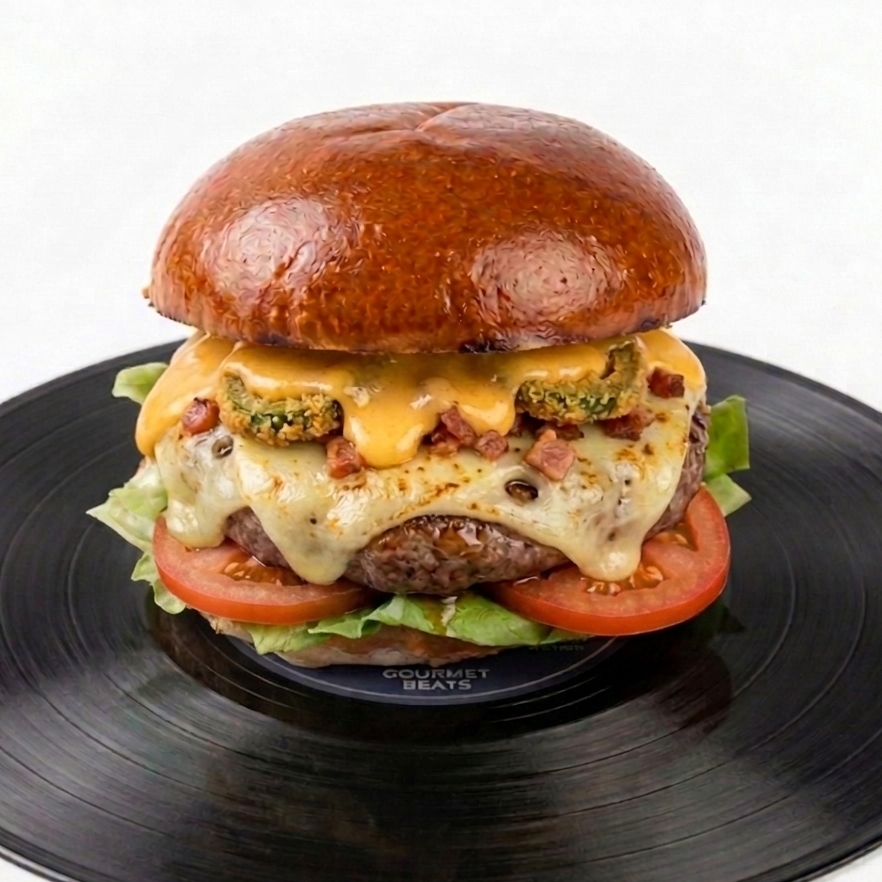 Nuestra estrella: carne jugosa escoltada por la sintonía del cheddar vibrante, el tocino ahumado y el picor audaz de los jalapeños fritos. Un solo de sabor diseñado para los que buscan algo más que una hamburguesa.