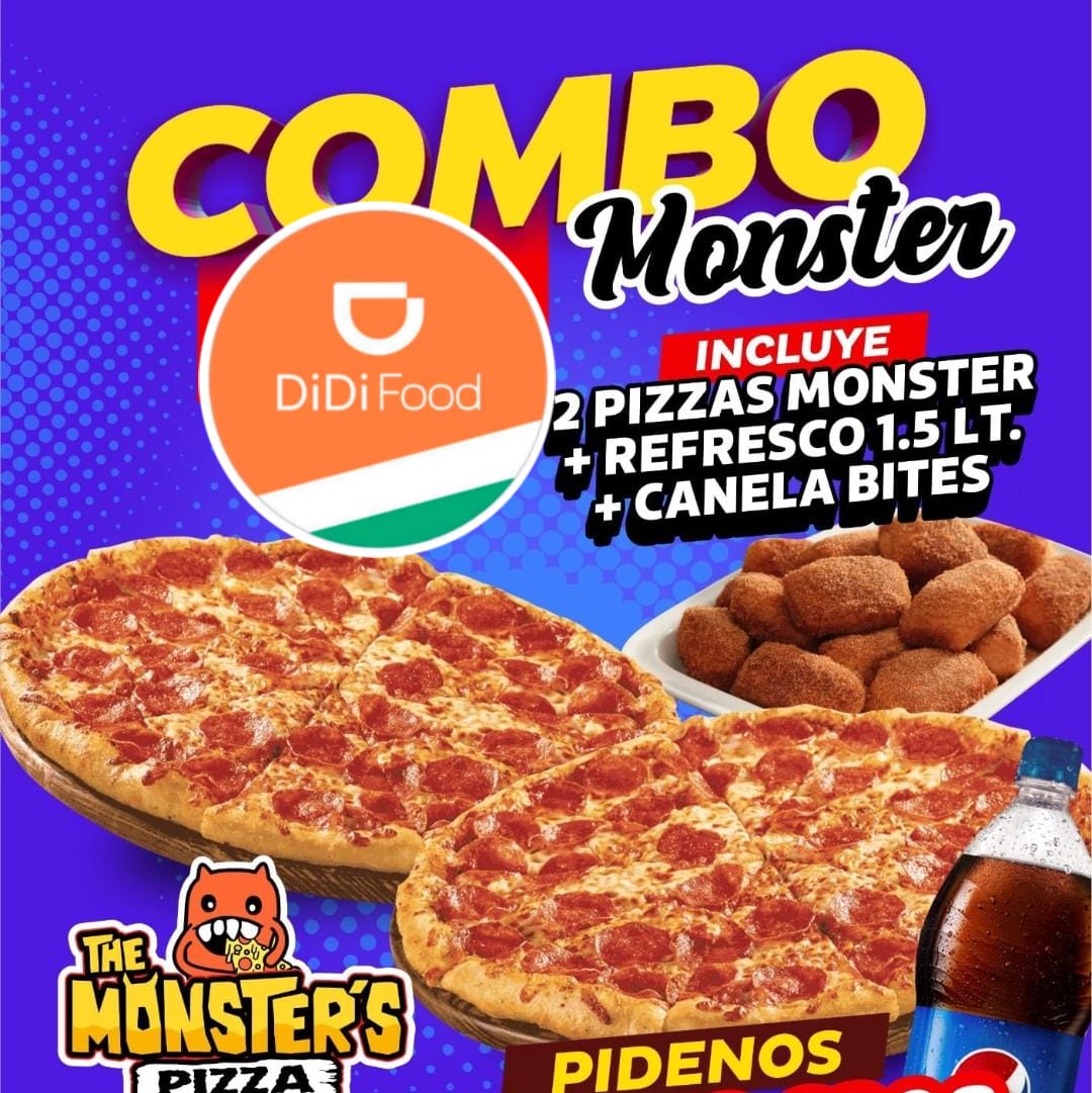 2 Pizzas monster peperoni , refresco 1.5 L más canela bites.