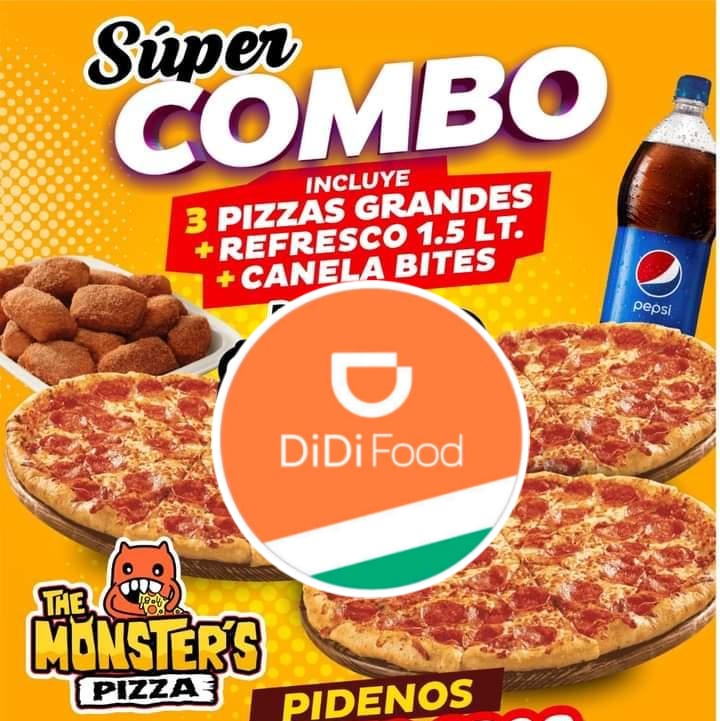 3 Pizzas monster de peperoni , refresco 1.5 L más canela bites.