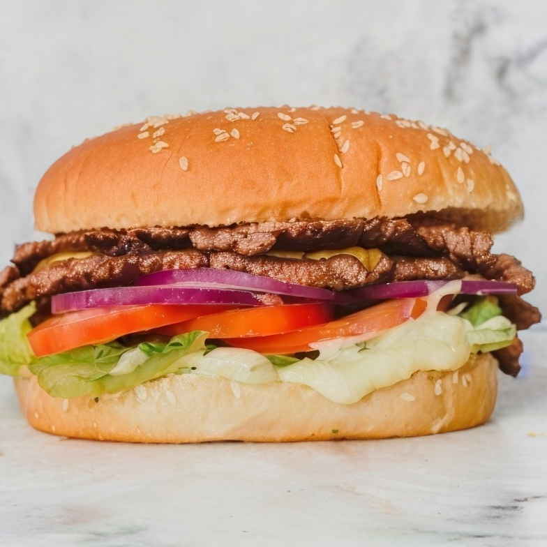 Doble carne tipo smash gratinada con queso amarillo tipo americano, aderezada con mayonesa de la casa, lechuga, jitomate y cebolla. Incluye papas gajo.