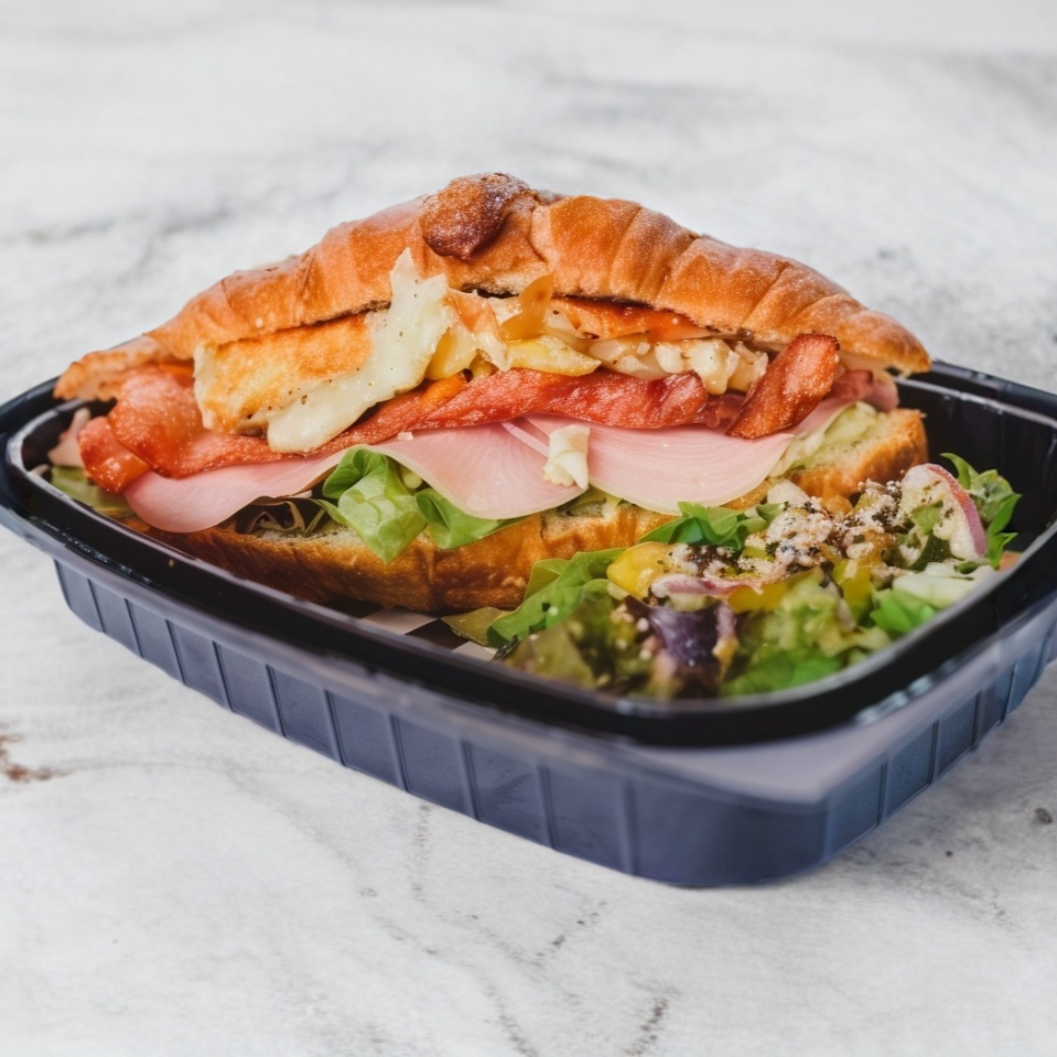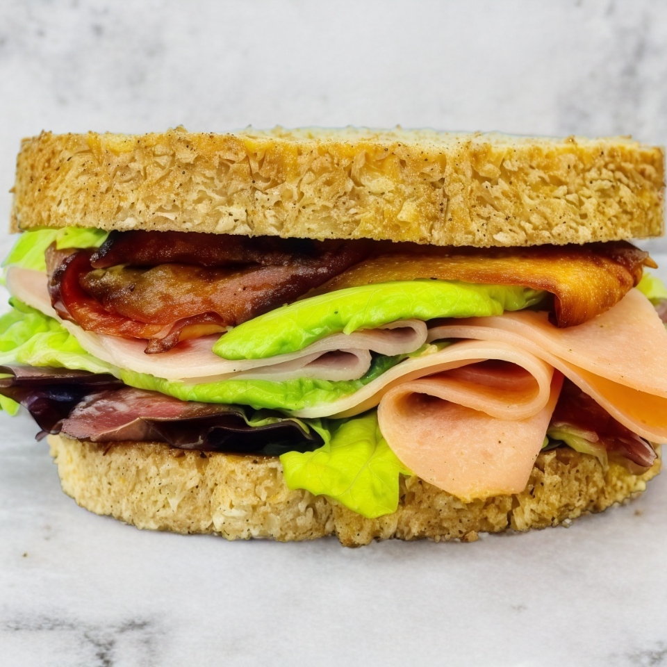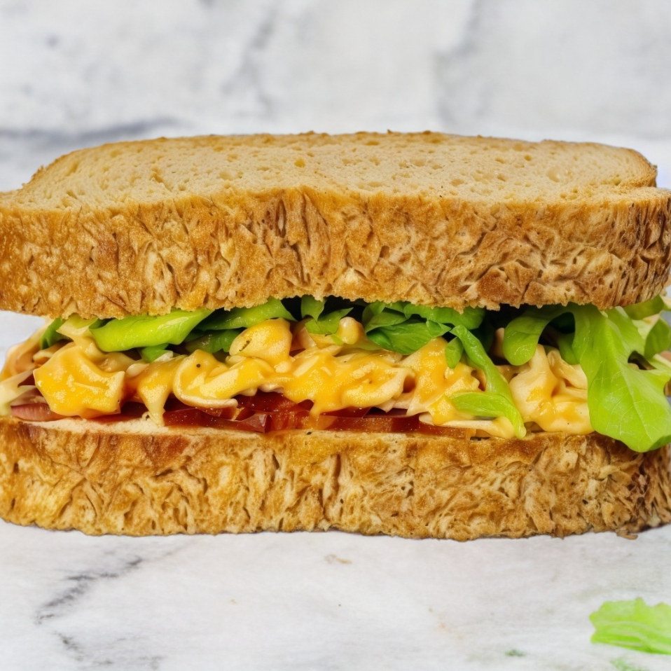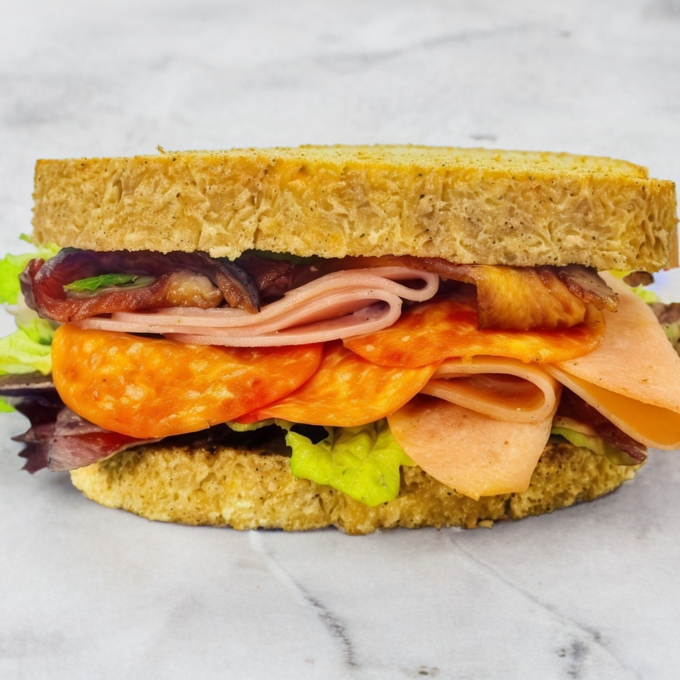 Pan integral, costra de queso gouda, jamón, pepperoni, tocino, lechuga, jitomate y cebolla. Aderezado con ranch y mostaza.