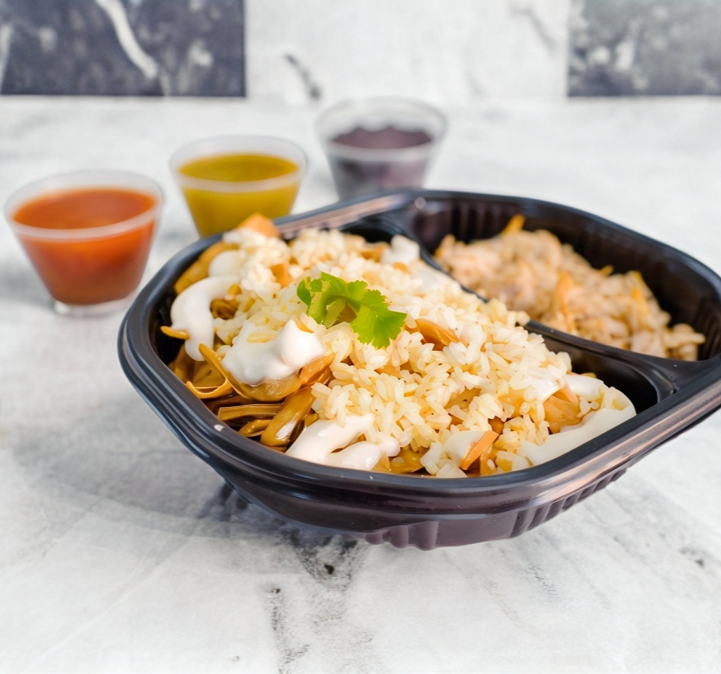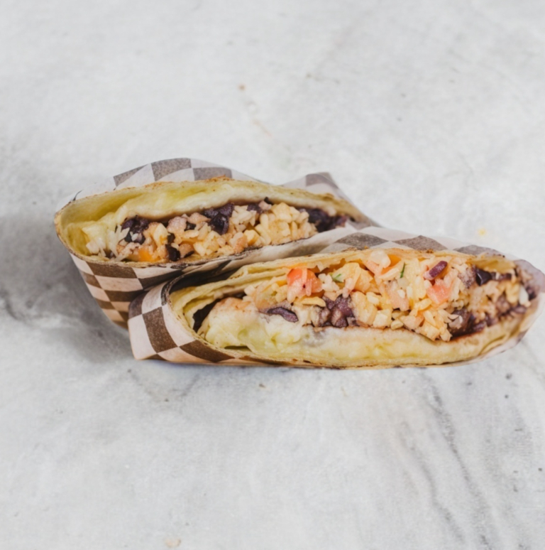 Burrito en tortilla de harina grande, relleno de huevo a la mexicana o a elegir (jamón, chorizo, champiñones o tocino), frijoles refritos y costra de queso mix.