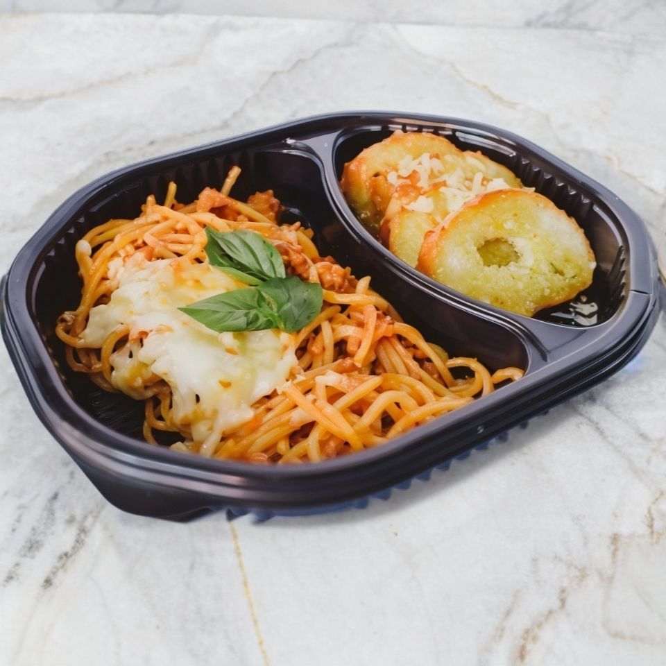 Espagueti bañado en salsa bolognesa de carne de res y pomodoro con queso parmesano rallado.