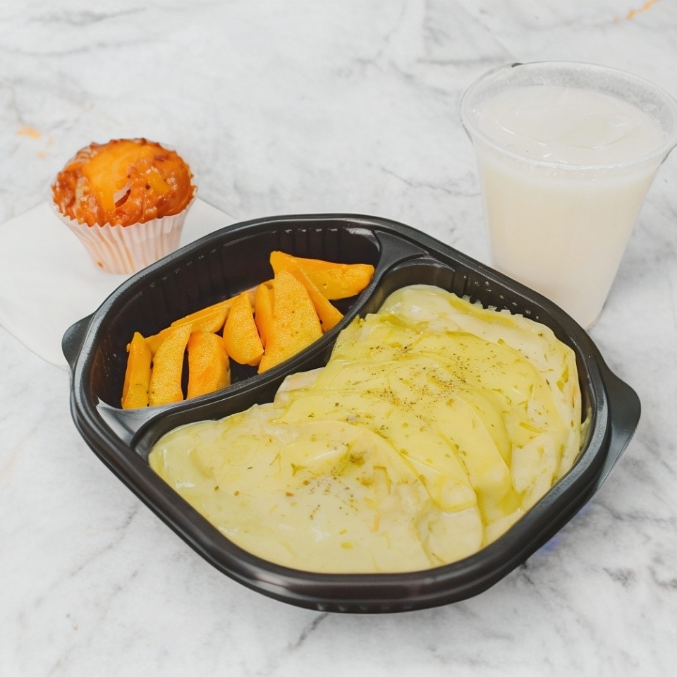 Croissant con costra de mix de quesos, dip de queso crema y finas hierbas, pechuga de pavo, tocino y huevo al gusto. Acompañado de ensalada de la casa (mezcal de lechugas, fresa, manzana, nuez caramelizada, queso de cabra y jalea de balsámico).