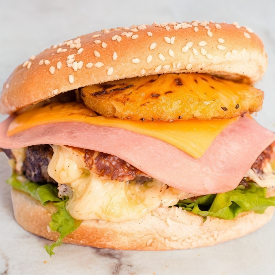 Carne de res tipo smash gratinada con quesos, mayonesa de la casa, jamón de y piña asada, lechuga, jitomate y cebolla. Incluye papas gajo.