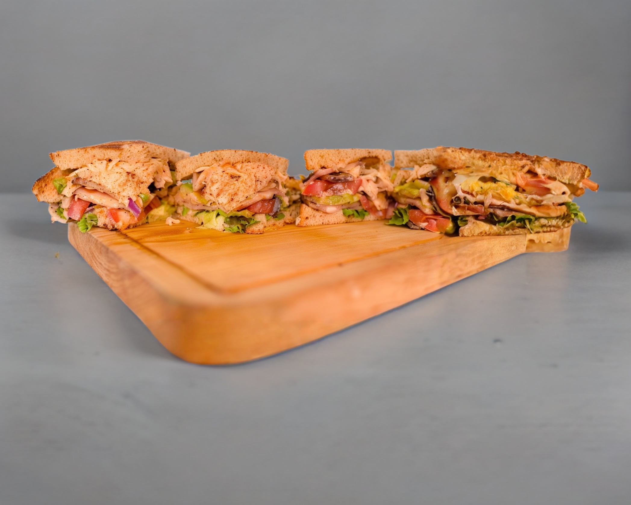 A base de tres capas de pan, un nivel de jamón de pavo con mezclas de queso, aderezo ranch, mostaza, jitomate, lechuga y cebolla y un segundo nivel de tocino y pollo con un toque de chipotle. Acompañado de papas gajo.