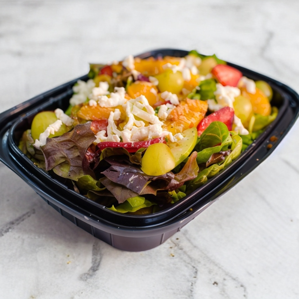 Mezcla de lechugas, fresa, durazno, nuez caramelizada y queso de cabra espolvoreado.