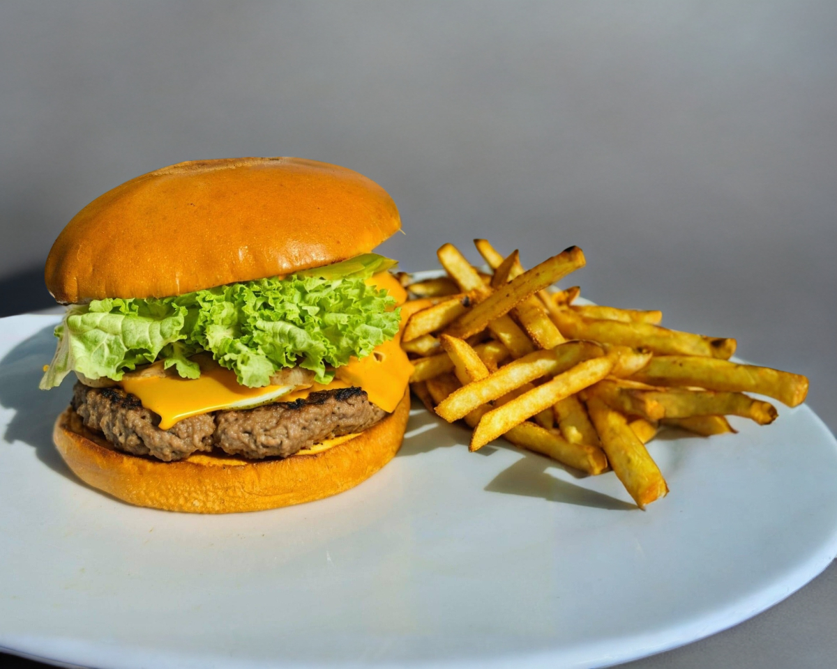 Hamburguesa con carne 100% de res (Choice, 140 gr), pan brioche, aderezo secreto, mostaza, mayonesa, queso amarillo, queso manchego, jitomate, lechuga y tocino ahumado, incluye 200 g de papas a la francesa. Porcion personal