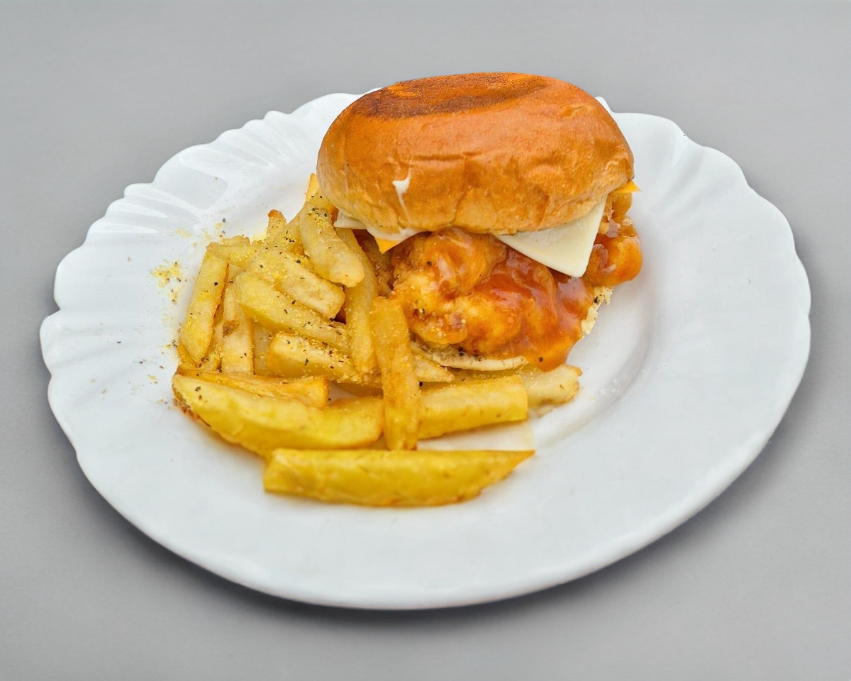 Hamburguesa con boneless hechos a mano (salsa a elegir), pan brioche, aderezo secreto, mostaza, mayonesa, queso amarillo, queso manchego, jitomate y lechuga