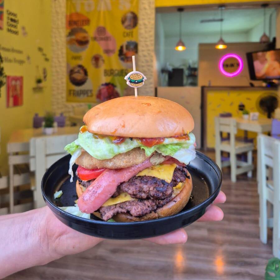 Hamburguesa con doble carne de res (140 gr), aros de cebolla. salchicha, aderezo, doble tocino, queso amarillo, jitomate y lechuga. GRATIS porcion de papas a la francesa