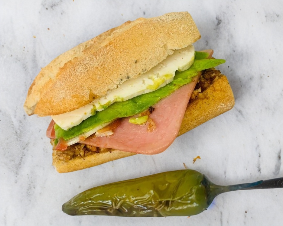 Torta de jamón con jitomate, cebolla, aguacate y queso