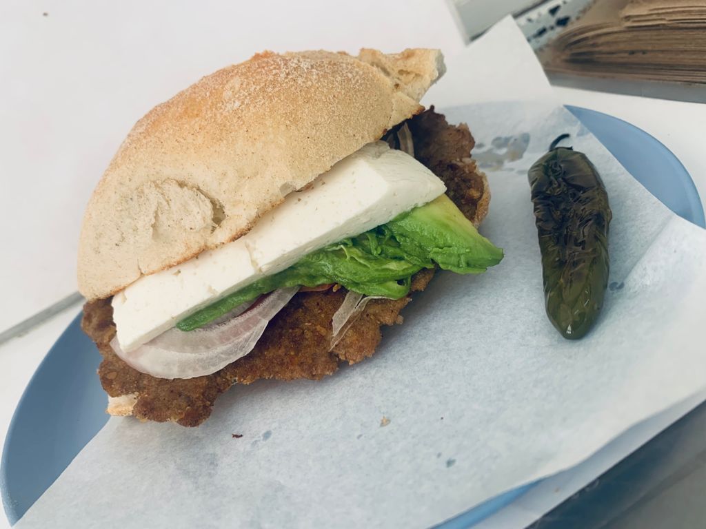 Torta de Milanesa 100% de res con jitomate, cebolla, aguacate y queso