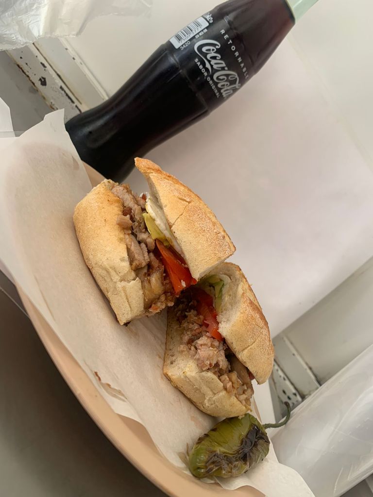 Torta de lomo con chorizo, con jitomate, cebolla, aguacate y queso