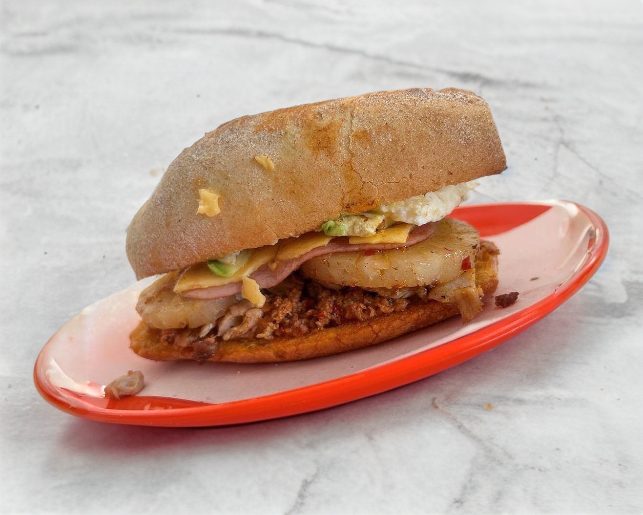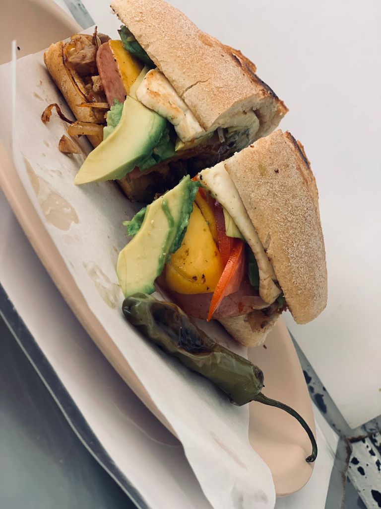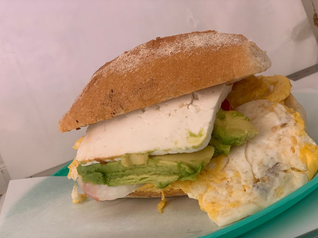 Torta de lomo, huevo, chorizo, jamón, queso amarillo, queso blanco caliente con jitomate, cebolla, aguacate y queso