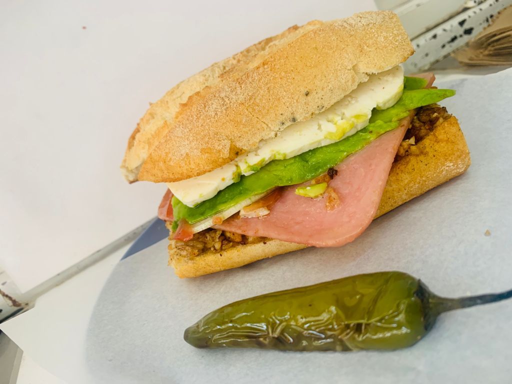 Torta de lomo con jamón, con jitomate, cebolla, aguacate y queso