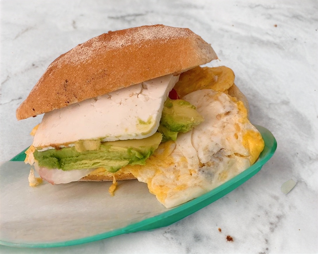 Torta de huevo con jamón, con jitomate, cebolla, aguacate y queso