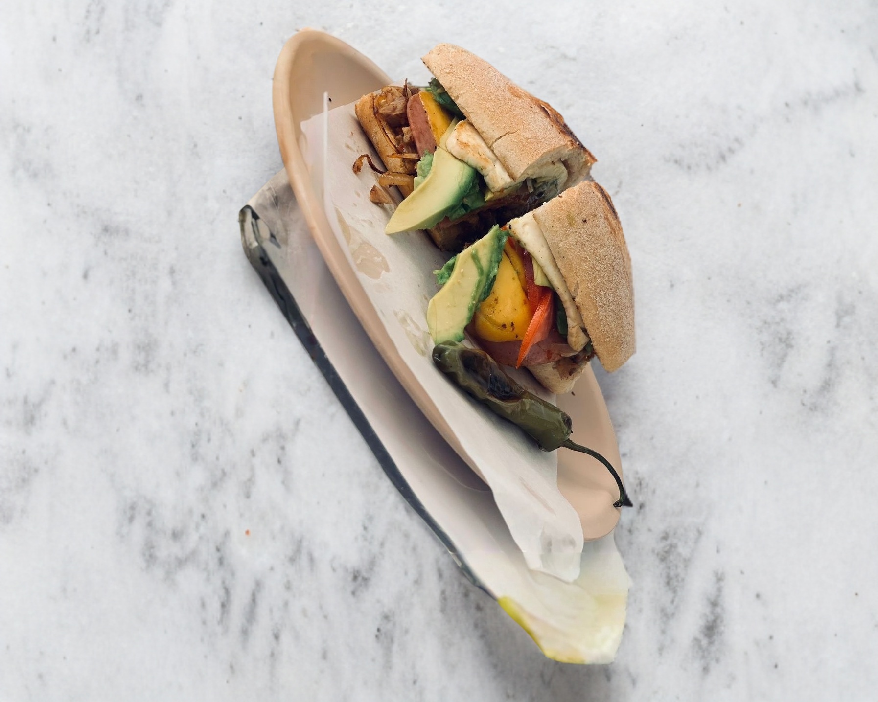 Torta de lomo, chorizo, jamón, queso amarillo con jitomate, cebolla, aguacate y queso