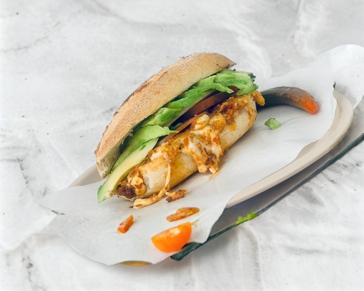 Torta de choriqueso con jitomate, cebolla, aguacate y queso