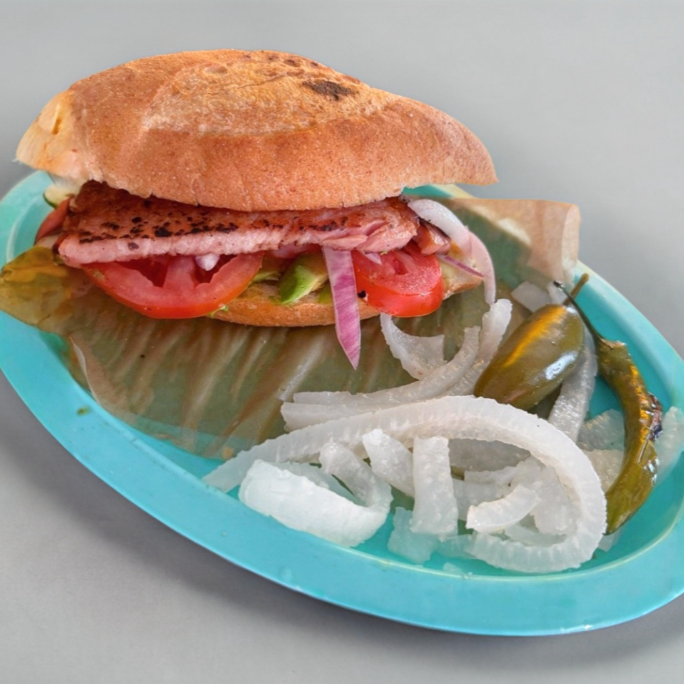 Chuleta ahumada, mayonesa, jitomate, cebolla y aguacate.
