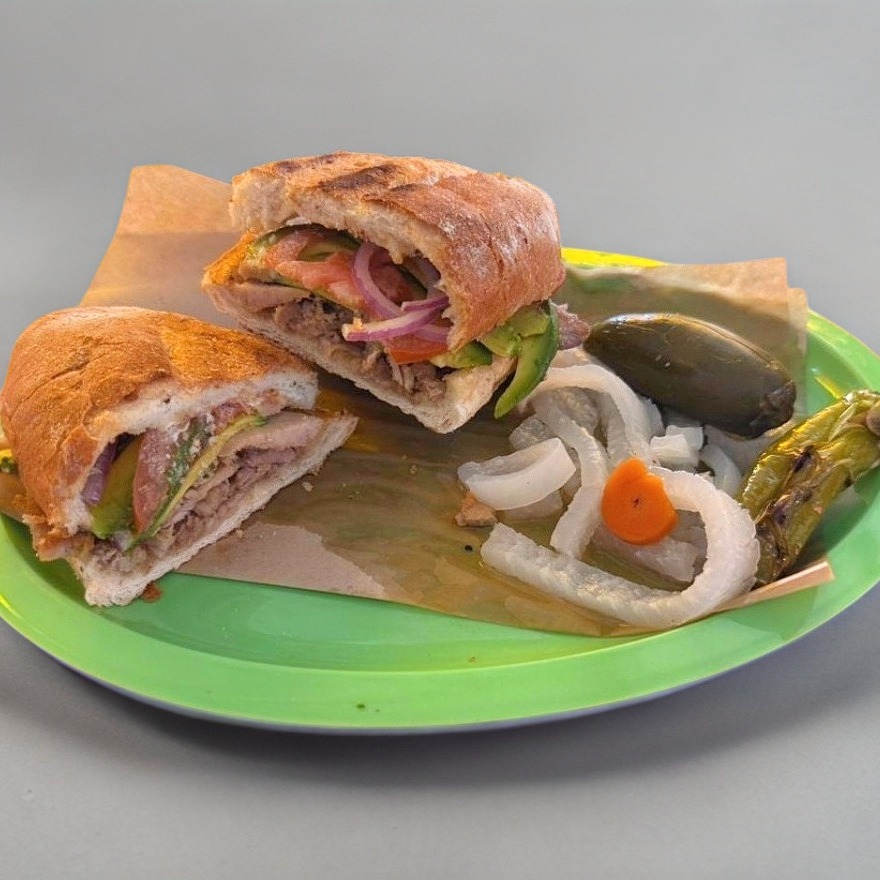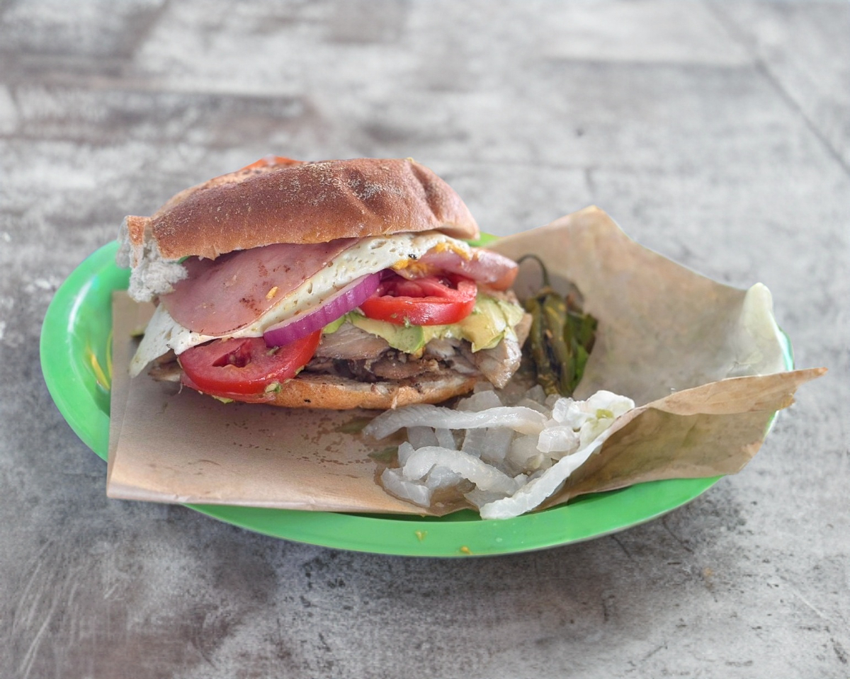 Mayonesa, huevo, lomo, queso amarillo, queso blanco, aguacate, jitomate y cebolla.