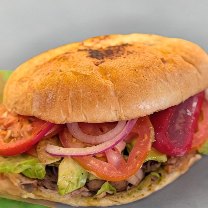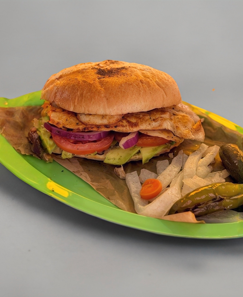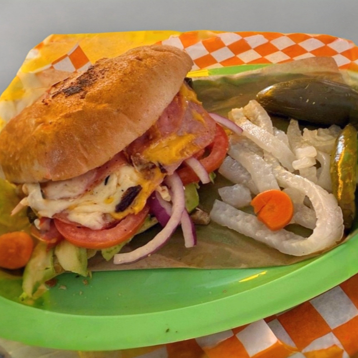 Milanesa de pollo, mayonesa, jitomate, cebolla y aguacate.