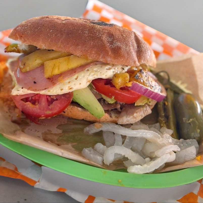 Mayonesa, lomo, piña, queso blanco, jitomate, cebolla y aguacate.