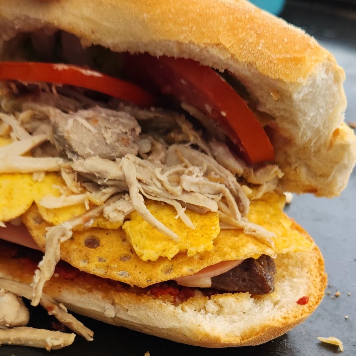 Deliciosa torta preparada con carne de cerdo premium, servida en pan artesanal con complementos frescos.