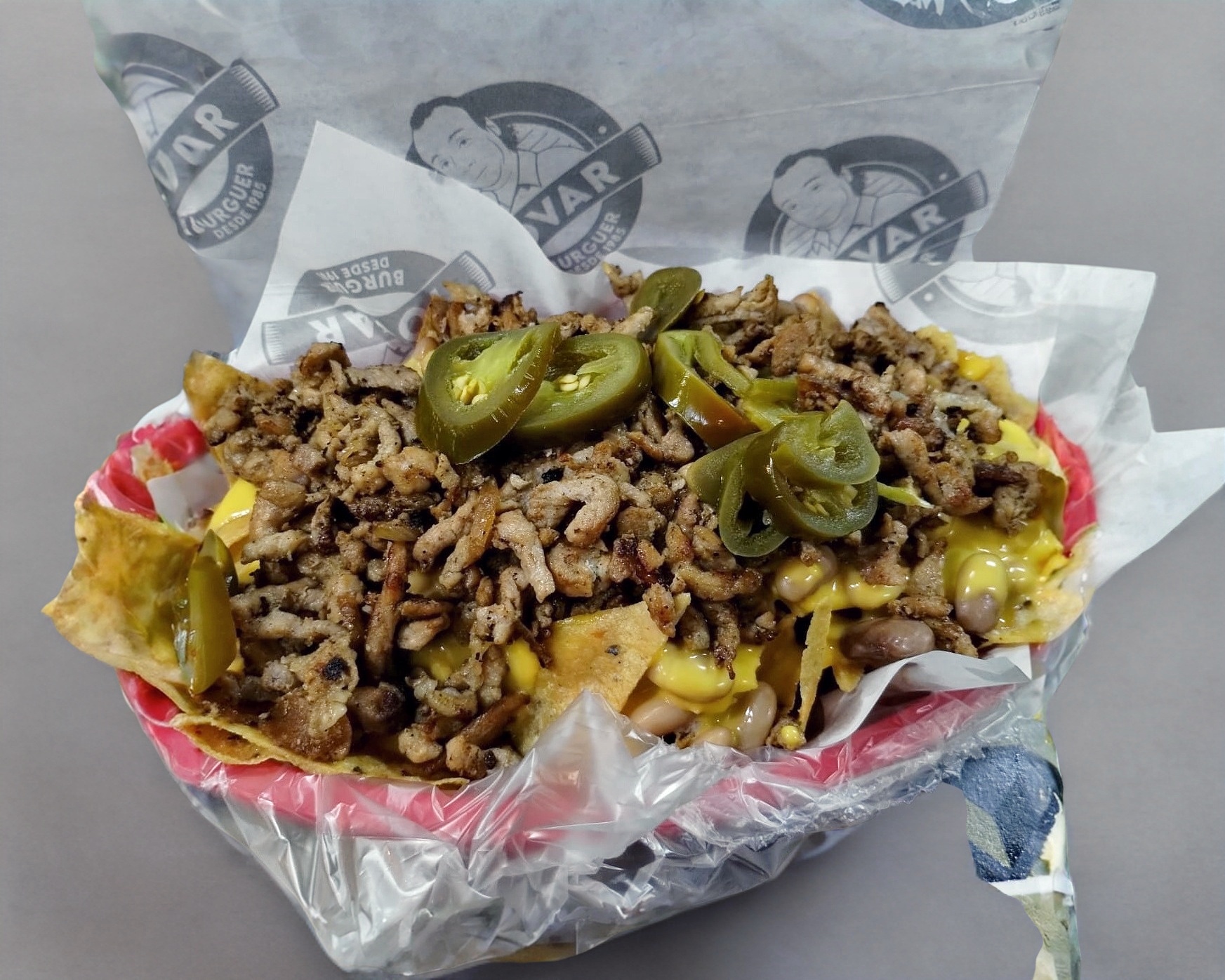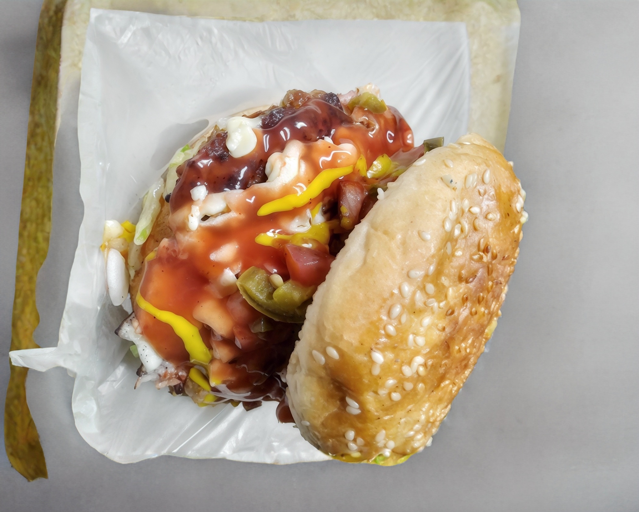 Carne de res, queso asadero, queso amarillo, tocino, verdura, aderezos y rajas. Pan parrillero.