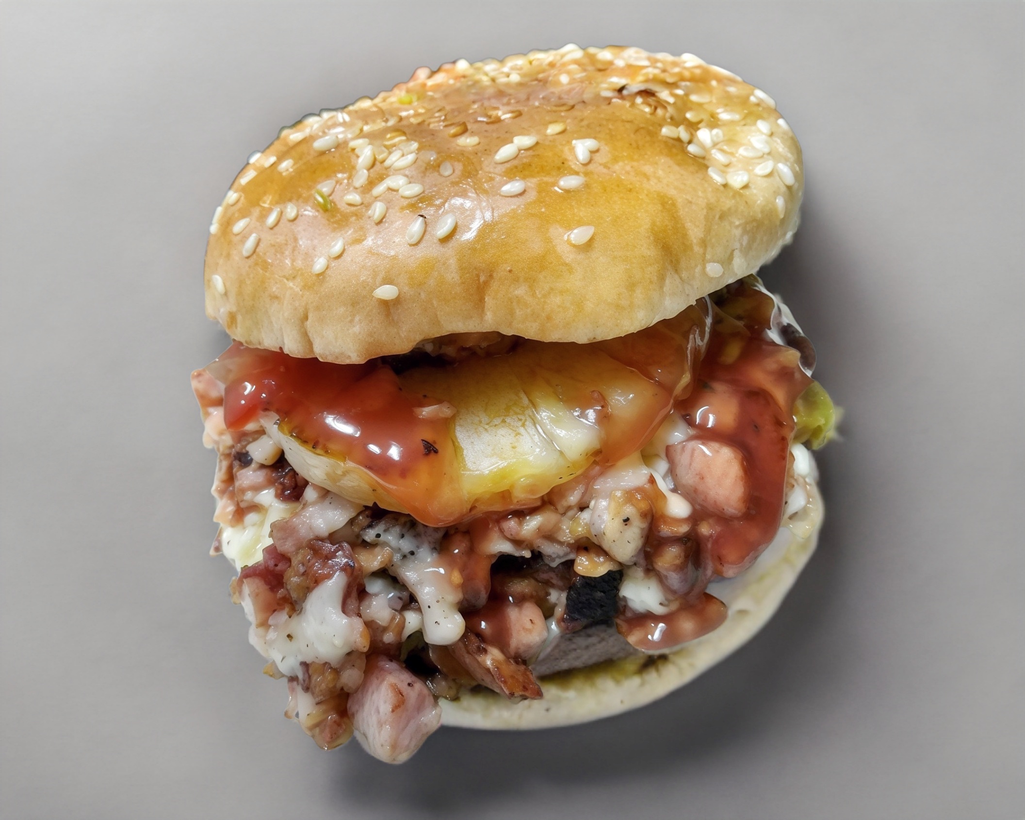 Carne de res, queso amarillo, queso asadero, tocino, piña, verdura, aderezos y rajas. Pan parrillero.