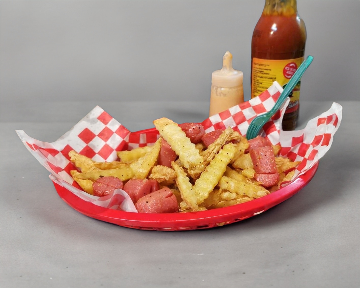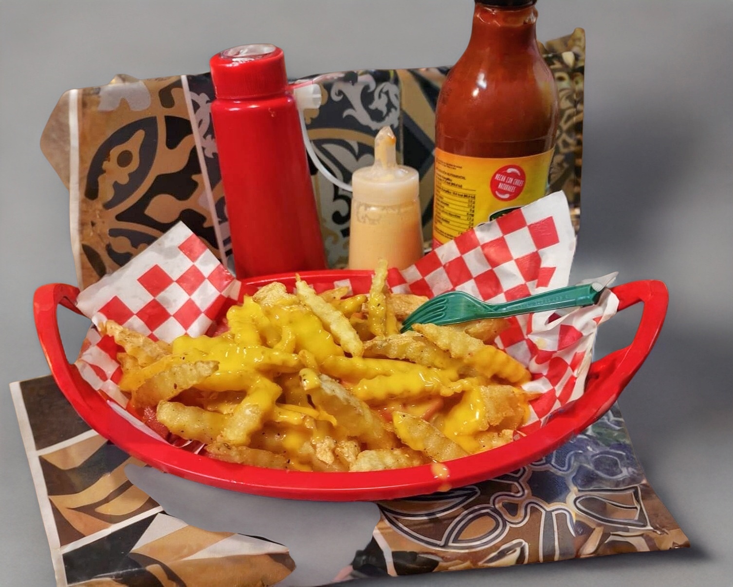 Papas fritas condimentadas con pimienta limón y con queso amarillo tipo cheddar