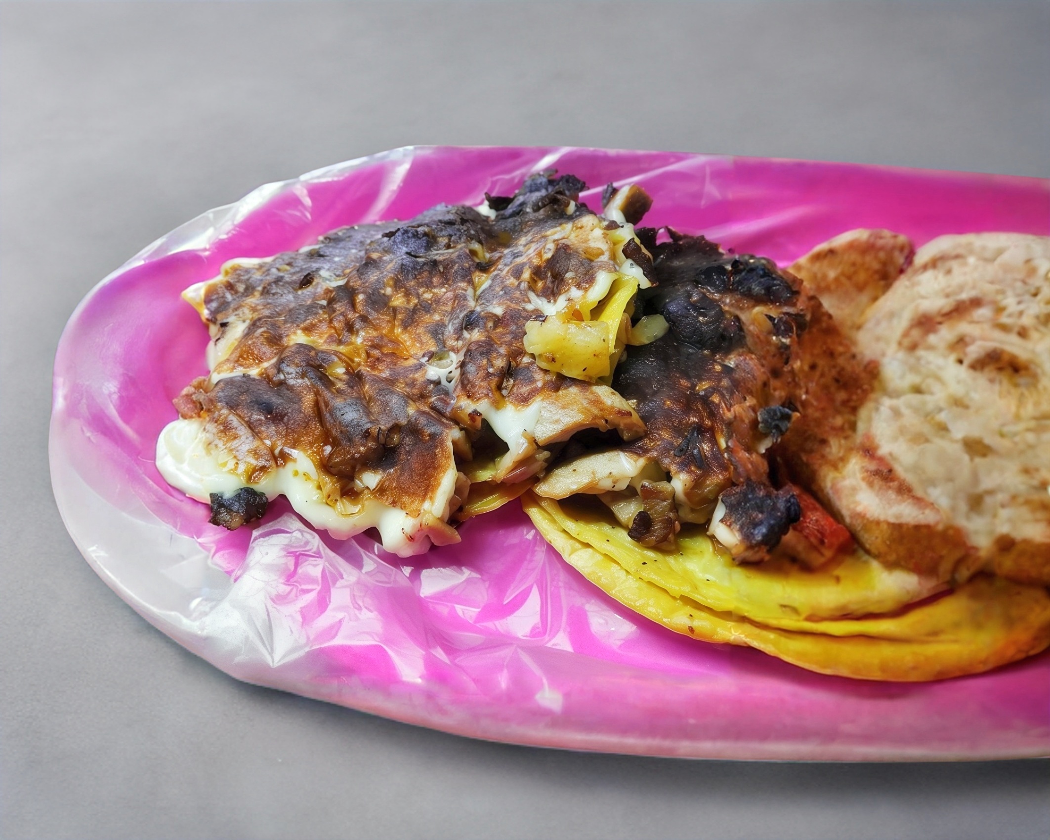 Doble tortilla de maíz con bistec de puerco con costra de queso