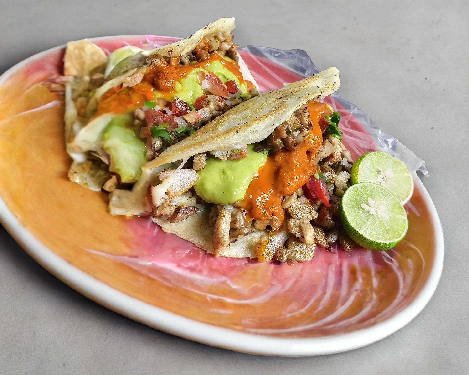 Arrachera con queso asadero en tortilla de harina, con salsas, roja, verde y pico de gallo
