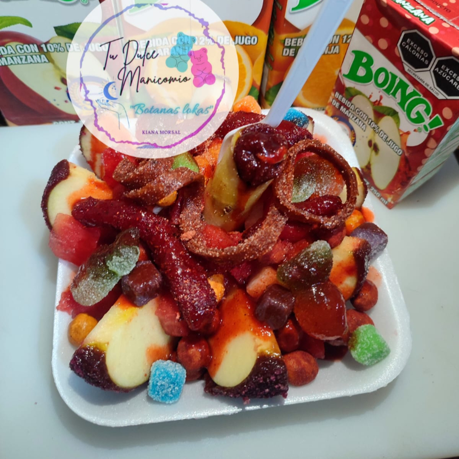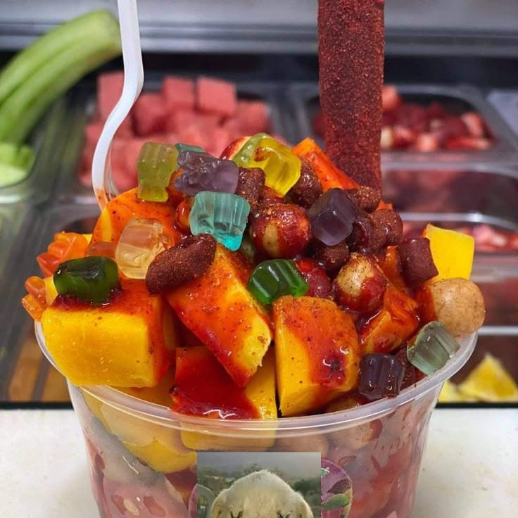DELICIOSOS TROZOS DE MANGO, CON GOMITAS CACAHUATES, FRUTA , CHAMOY Y MIGUELITO