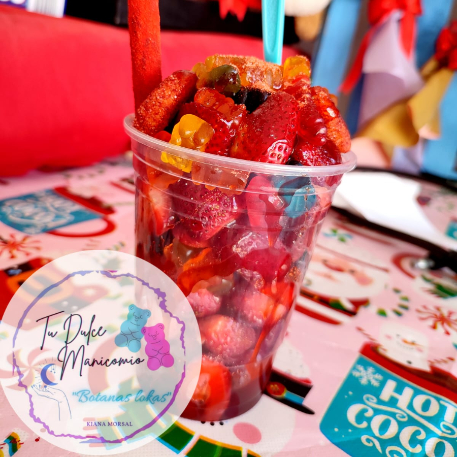UNA DELICIOSA COMBINACION, FRESAS CON CHAMOY DE PELON PELORICO, CON GOMITAS Y MIGUELITO