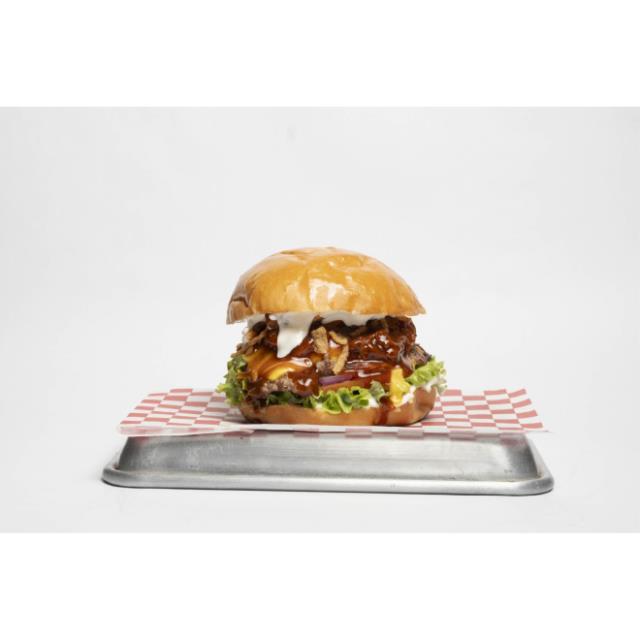 PAN DE PAPA, DOBLE CARNE SMASH, PULLED PORK BBQ, QUESO CHEDDAR, ADEREZO QUESO CABRA, ENSALADA DE COL, CEBOLLA CRISPY