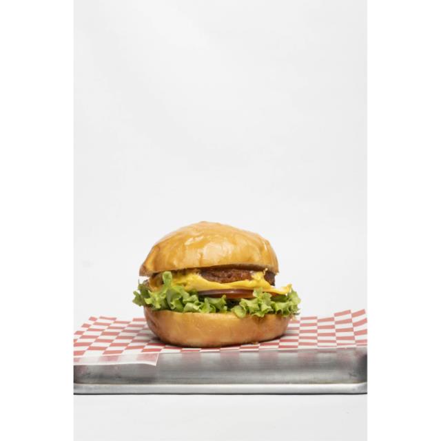 PAN DE PAPA, CARNE HECHA A BASE DE FRIJOL Y QUINOA, QUESO CHEDDAR, ADEREZO TUNNS, LECHUGA, JITOMATE Y CEBOLLA