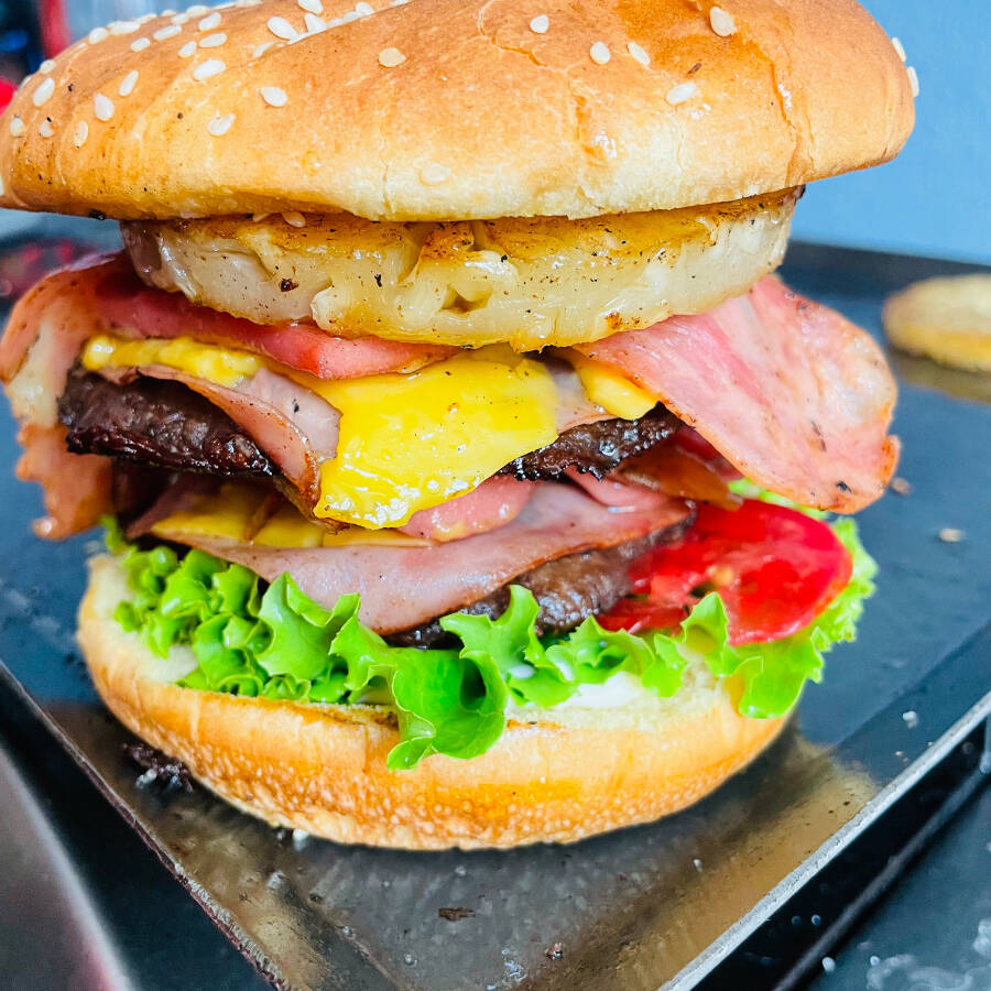Doble carne de res doble queso , doble jamón , piña ,tocino , lechuga, tomate ,cebolla y chiles