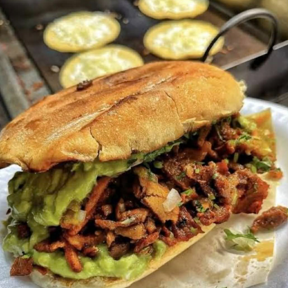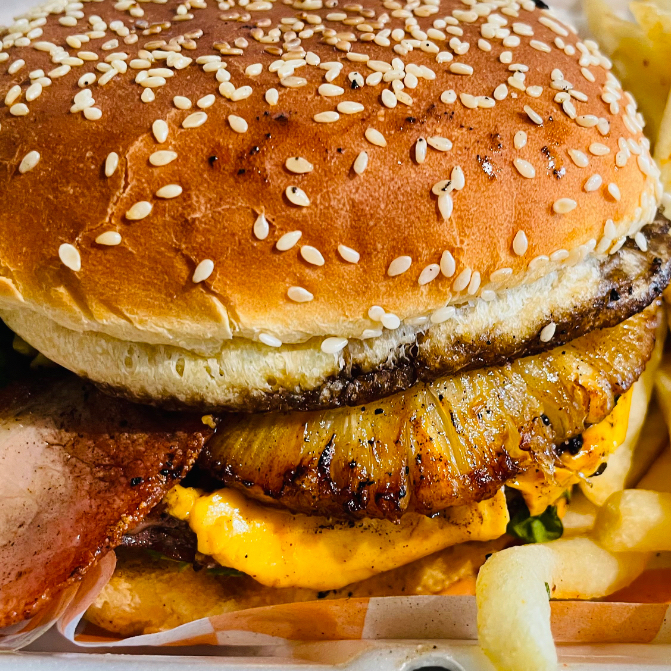 Carne de res, piña, jamon , tocino , lechuga, cebolla , tomate y chile