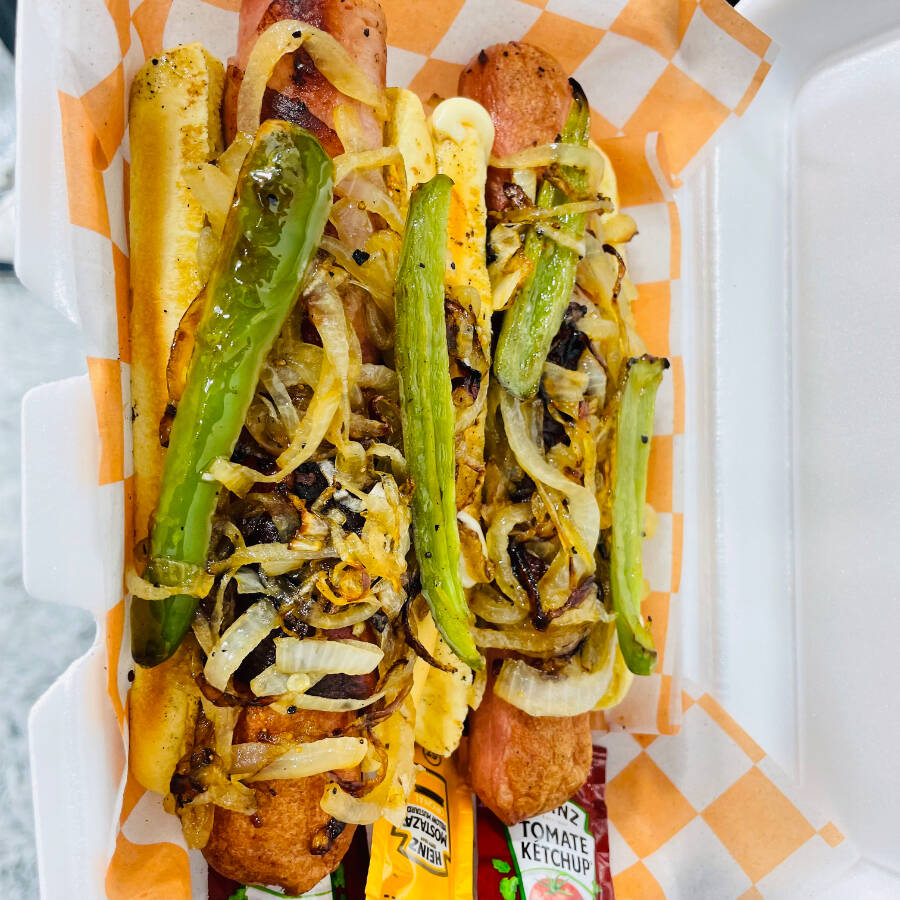 Salchicha, cebolla caramelizada , chile asado y tocino