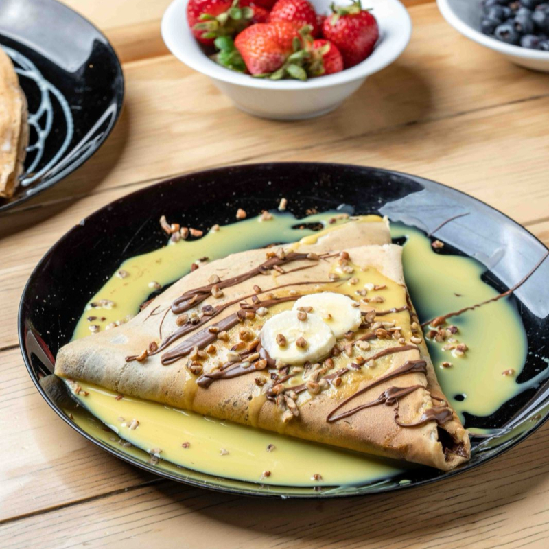 Deliciosa crepa bañada en rompope como base Nutella con plátano canela y nuez natural.