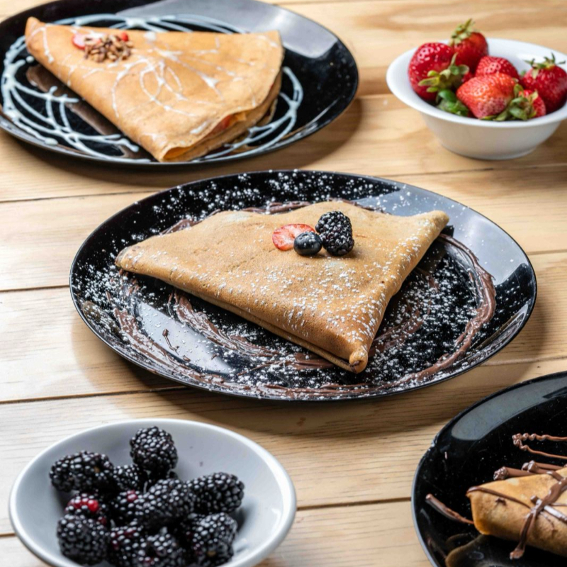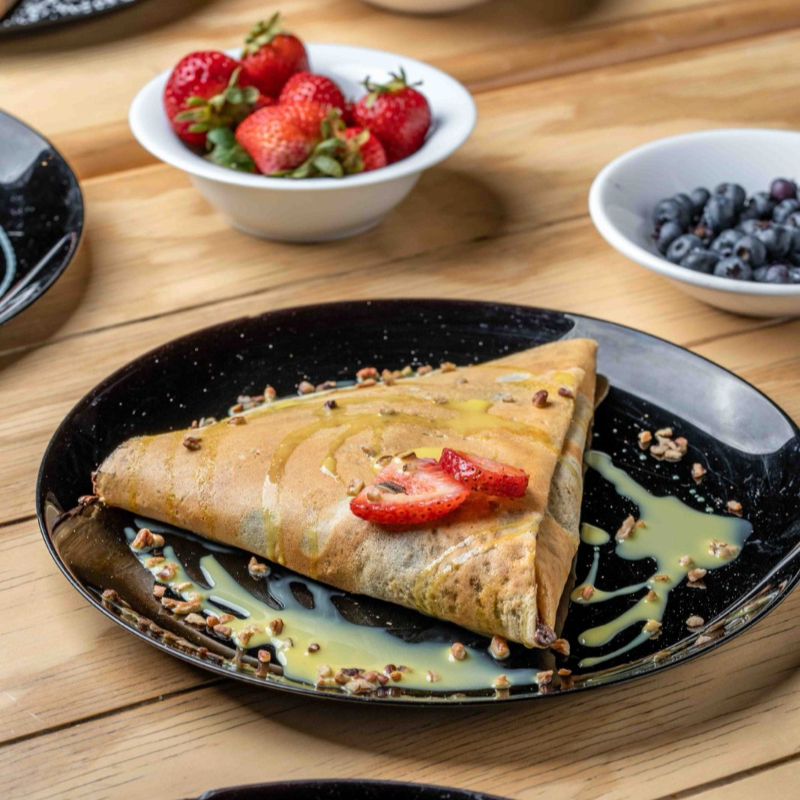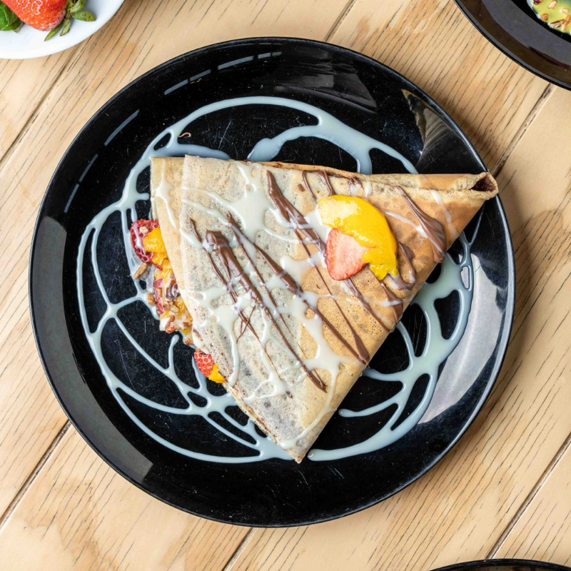 1 Crepa con el ingrediente de tu elección. Agrega a tu crepa con valor adicional una deliciosa ensalada de frutas compuesta por manzana, plátano, fresa, durazno, uva, mora azul natural como aderezo yogurt natural y granola como cereal.