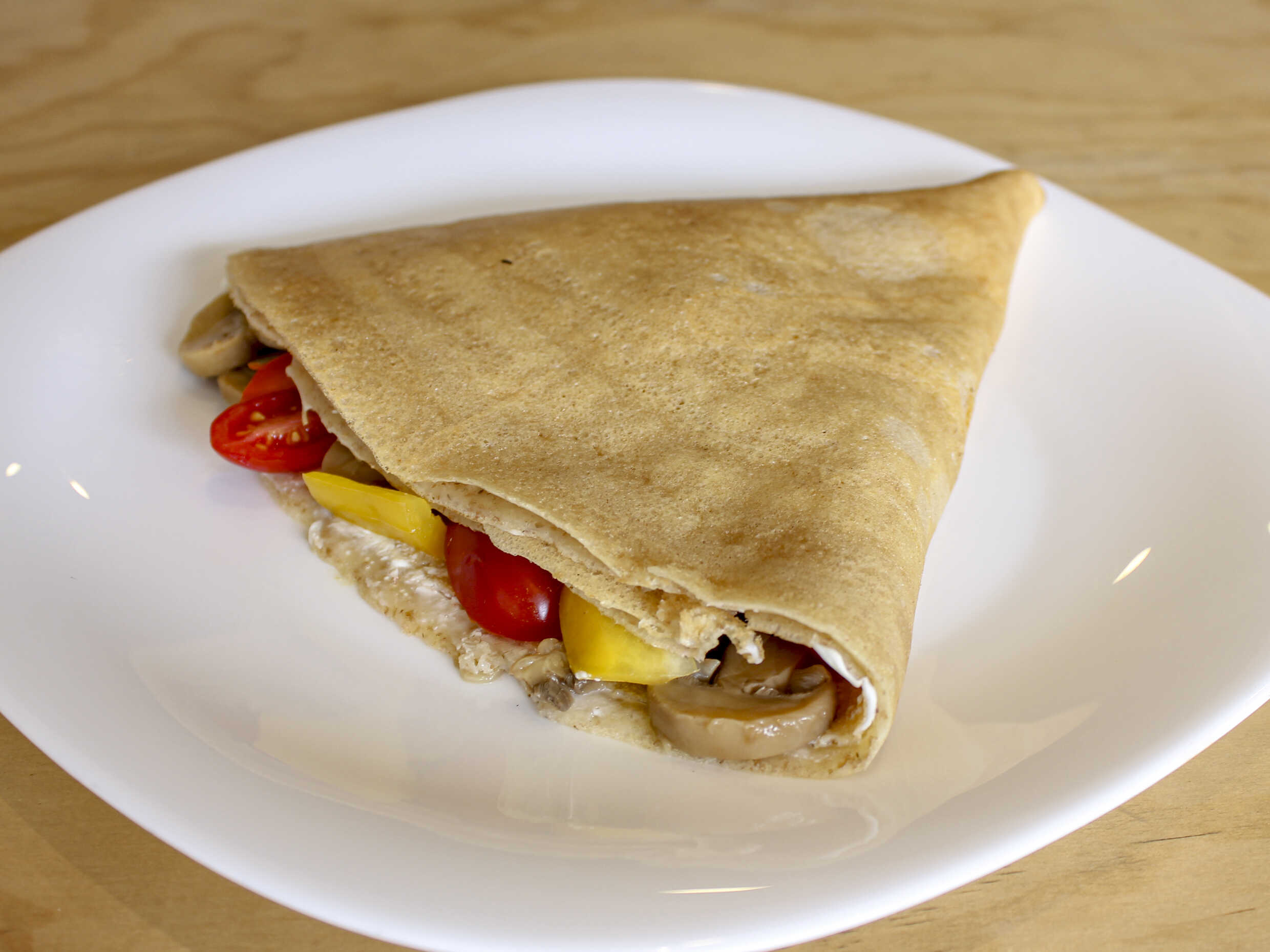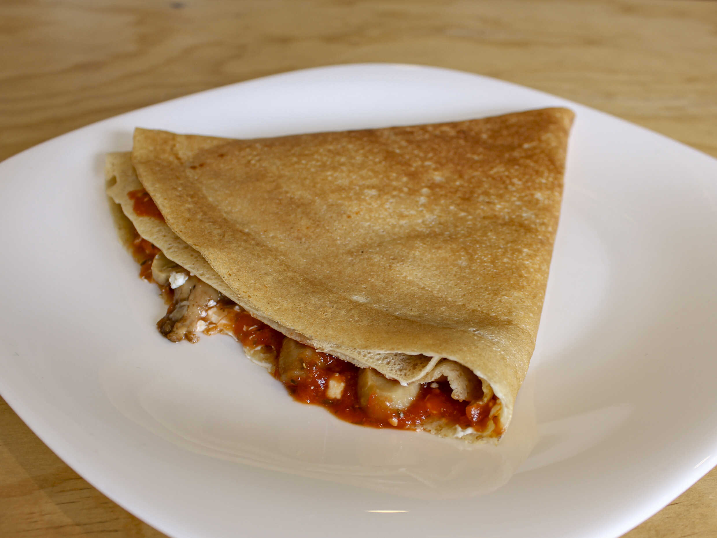 Crepa hecha a base de queso philadelphia con salsa de tomate y champiñones (todas nuestras crepas llevan pimienta)